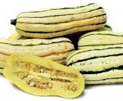 Courge Delicata Chair peu épaisse jaune pâle. Goût de noisette, et de châtaigne se développant à la cuisson. Se consomme crue, râpée, en vinaigrette ou frite, à la vapeur, au four, farcie, etc. Remplace la pomme de terre pour les frites: Couper en lanière (attention, c’est difficile!) et frire. |