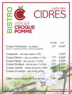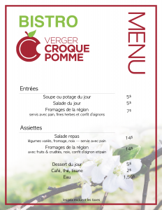 Notez que sous le bistro, se trouve le casse-croûte! qui lui, est bien opérationnel pendant la saison des pommes, chaque fin de semaine, de 10h à 16h. On y sert des hot dog (grosse saucisse porc & pomme avec pain) et des frites, plus quelques autres items de saison!